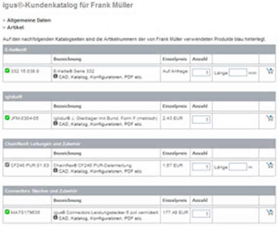 With your own do-it-yourself customer catalog, every customer can compile his/her own selection of relevant items directly from the igus® product portfolio. Thus an individual parts overview can be displayed in the myigus space immediately after log-in.