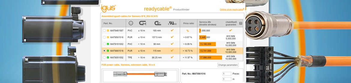 As of now, it is even easier to find pre-assembled connection and extension cables suitable for all large motor and gearbox manufacturers. Entering the specific manufacturer's part number, or selecting the manufacturer and the required cable type provides the required result; whether suitable for Siemens, SEW, Beckhoff, Bosch Rexroth or many other suppliers of drive technology.  An overview of the different cables with the pertinent information, such as jacket material, oil resistance or bending radius, is shown at a glance. All cables are suitable for chains and therefore impress with their usual igus® qualities for highly dynamic applications.