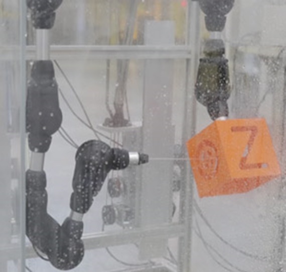 All joints are operated with draw wires. 2 wires are needed for each degree of freedom (antagonistic principle). If the wires of the upper joint (2) were to be routed through the lower joint (1) without being guided, the movements of the two joints would no longer be independent of each other. In order to achieve this independence, it is necessary that the wire tension of the upper joint (2) is uncoupled from the movements of the lower joint (1). This is done by means of a special Bowden cable system in the opening of the lower joint (see illustration). The wires them move freely next to each other in the connecting tubes between the joints.