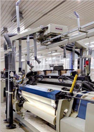 Travelling cleaners are installed in these textile machines to suction off fluff and waste during spinning or weaving. The cleaners move from one end of the machine to the other at a speed of up to 16 metres per second over a distance of 70 metres. Before an e-chain® was used, the power cable regularly became tangled, leading to short-circuits and cleaner downtime. The e-chain® has put an end to the problem.